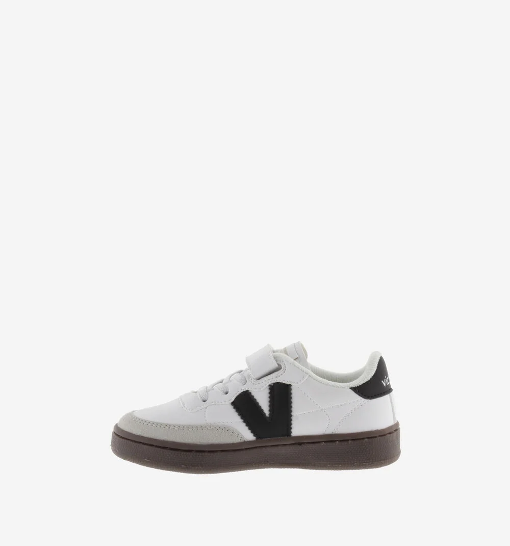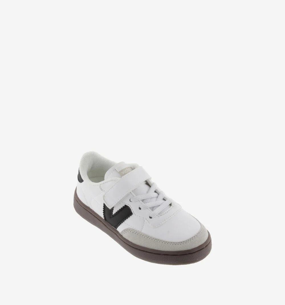 Descubre nuestras zapatillas deportivas para niños de corte ciclista, diseñadas para ofrecer comodidad y sostenibilidad. Están fabricadas en material efecto piel con una pieza de serraje en la puntera para mayor durabilidad. El logo impreso en la parte trasera y la V negra en el lateral aportan un estilo elegante.